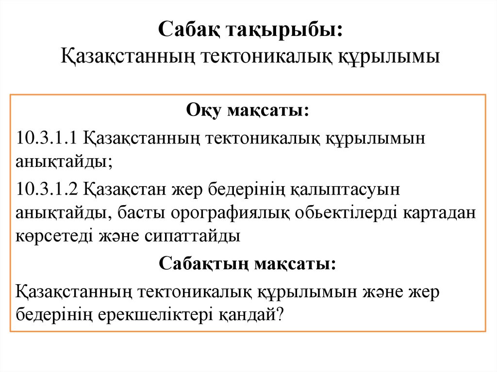 Оқу мақсаты:10.3.1.1 Қазақстанның тектоникалық құрылымын