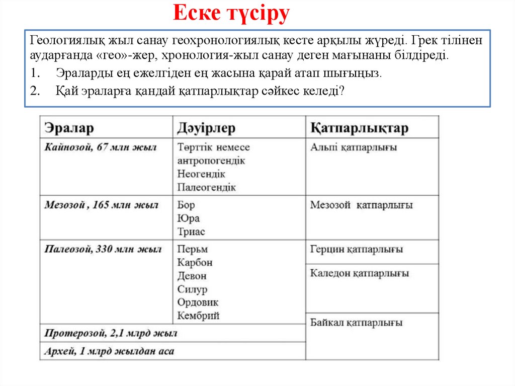 Еске түсіруГеологиялық жыл санау геохронологиялық кесте арқылы жүреді. Грек тілінен