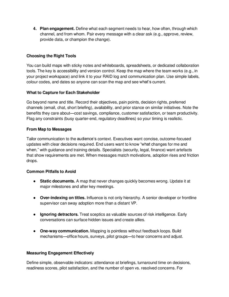 high-influence stakeholders, track whether decisions happen on schedule. For high-interestusers, track training completion and early adoption. These metrics show where to invest more