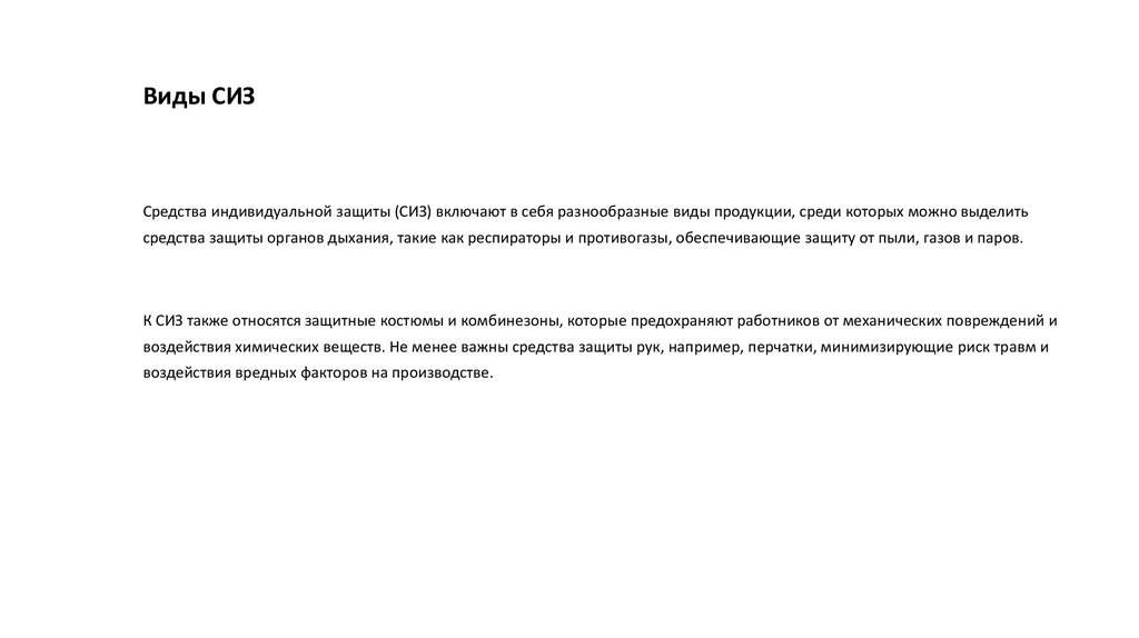 Виды СИЗСредства индивидуальной защиты (СИЗ) включают в себя разнообразные виды продукции, среди которых можно выделить