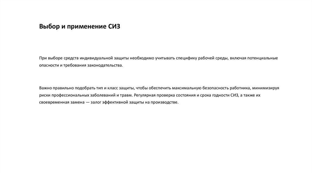 Выбор и применение СИЗПри выборе средств индивидуальной защиты необходимо учитывать специфику рабочей среды, включая потенциальные