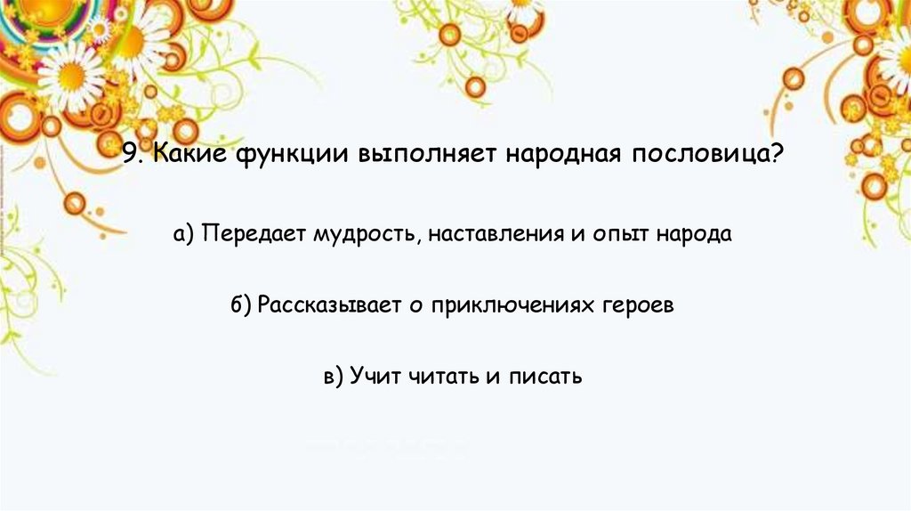 9. Какие функции выполняет народная пословица?а) Передает мудрость, наставления и опыт народа