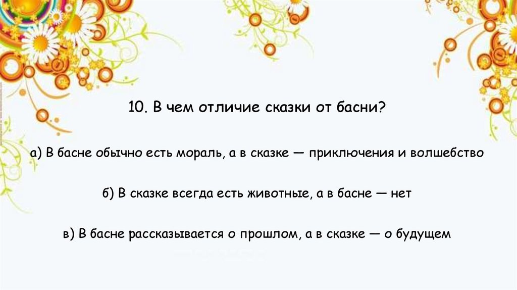 10. В чем отличие сказки от басни?а) В басне обычно есть мораль, а в сказке — приключения и волшебство