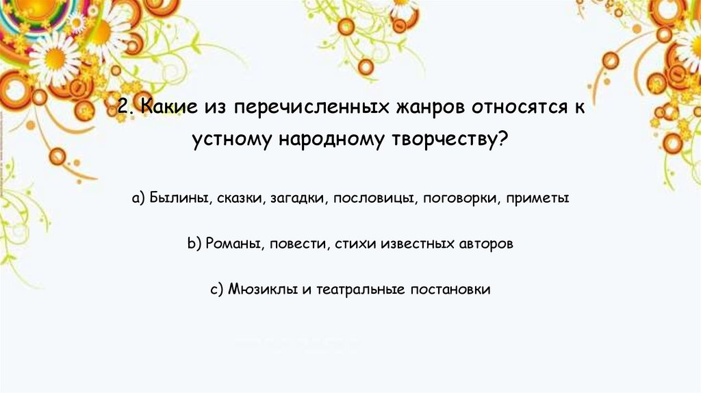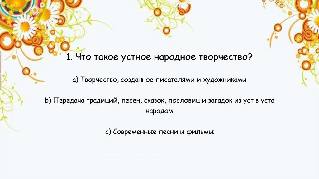 1. Что такое устное народное творчество?a) Творчество, созданное писателями и художниками