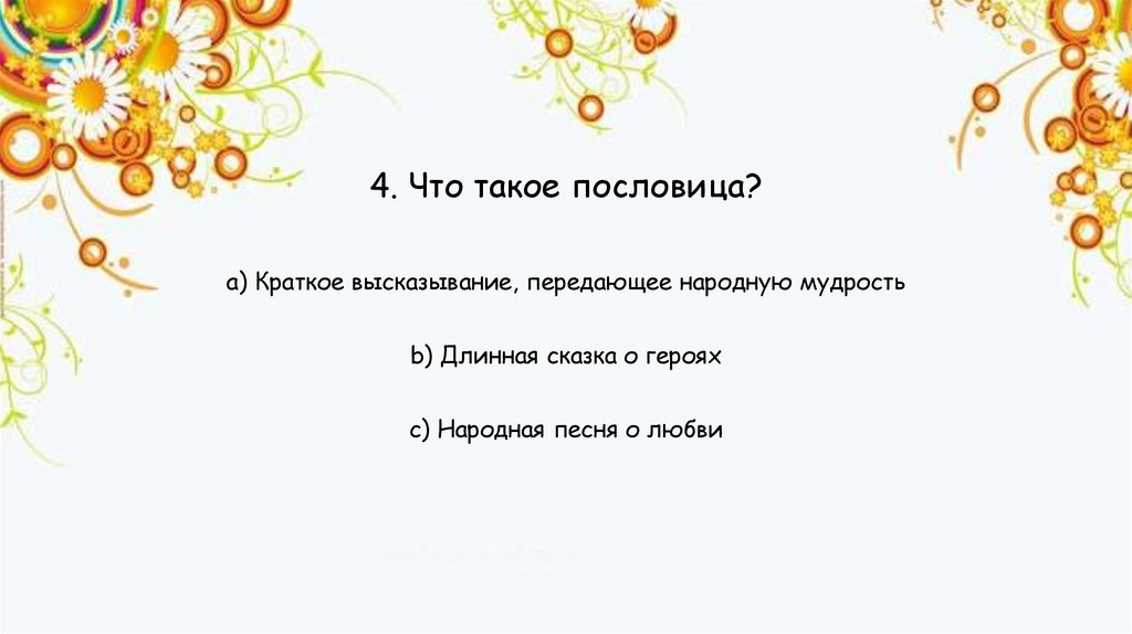 4. Что такое пословица?a) Краткое высказывание, передающее народную мудрость