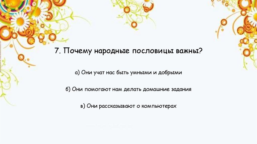 7. Почему народные пословицы важны?а) Они учат нас быть умными и добрыми