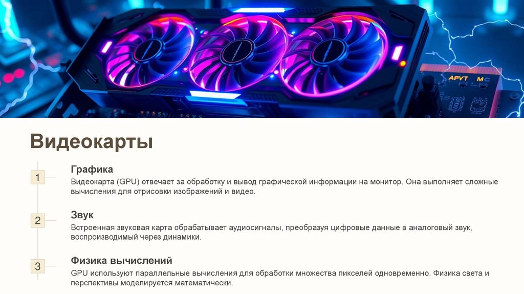 Видеокарта (GPU) отвечает за обработку и вывод графической информации на монитор. Она выполняет сложные