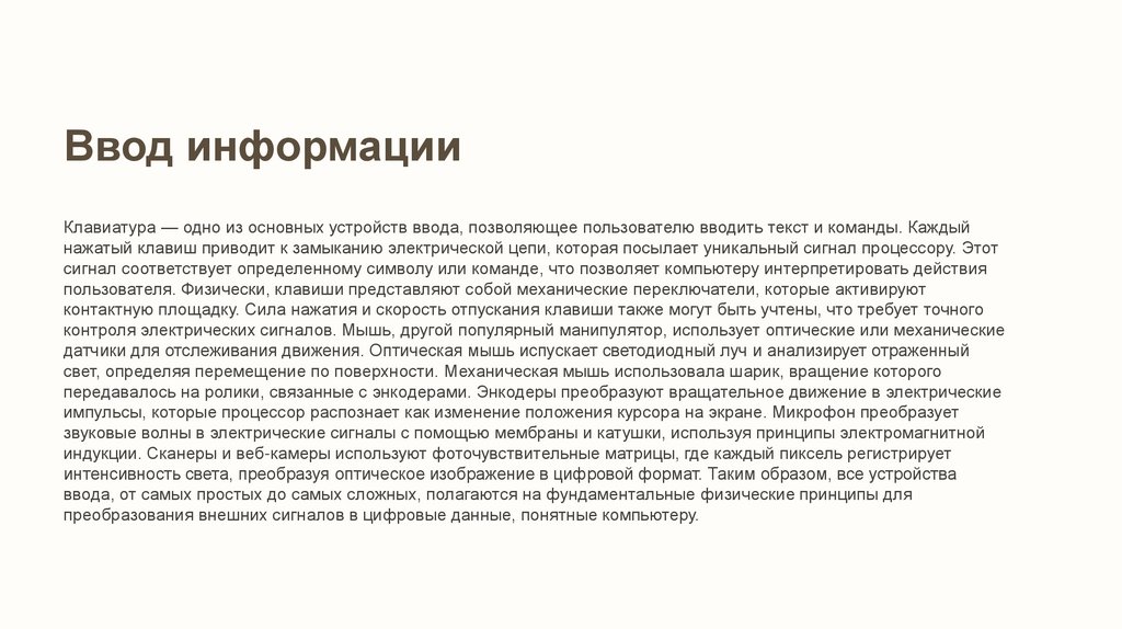 Ввод информацииКлавиатура — одно из основных устройств ввода, позволяющее пользователю вводить текст и команды. Каждый