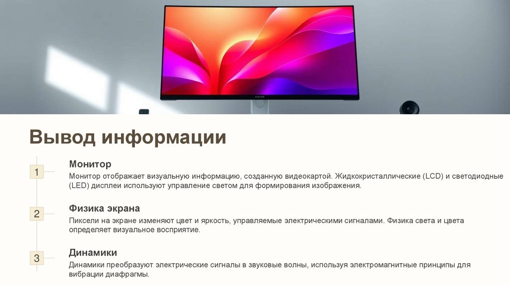 Монитор отображает визуальную информацию, созданную видеокартой. Жидкокристаллические (LCD) и светодиодные