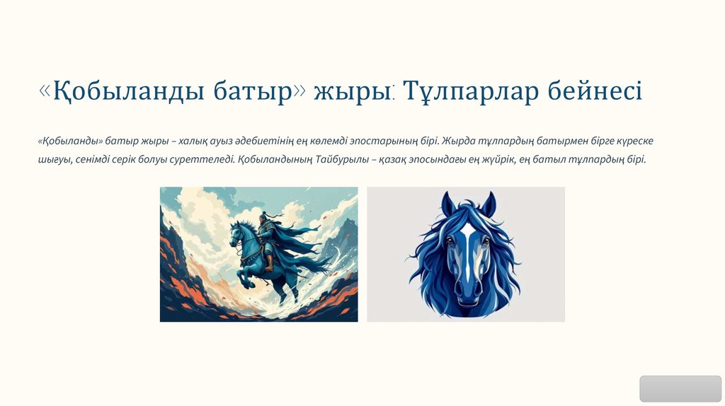 «Қобыланды батыр» жыры: Тұлпарлар бейнесі«Қобыланды» батыр жыры – халық ауыз әдебиетінің ең көлемді эпостарының бірі. Жырда тұлпардың батырмен бірге күреске