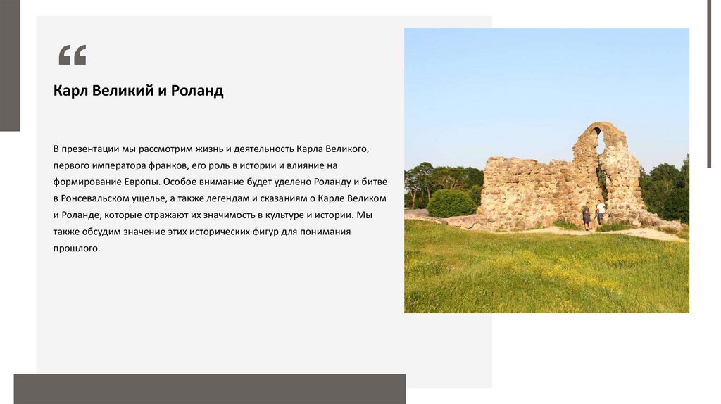 Карл Великий и РоландВ презентации мы рассмотрим жизнь и деятельность Карла Великого,