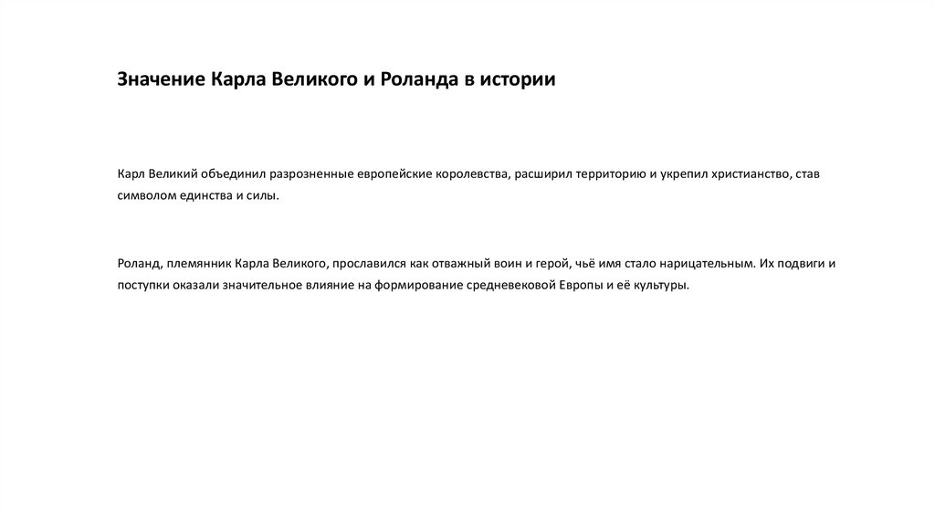Значение Карла Великого и Роланда в историиКарл Великий объединил разрозненные европейские королевства, расширил территорию и укрепил христианство, став