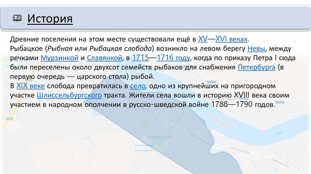 Рыбацкое (Рыбная или Рыбацкая слобода) возникло на левом берегу Невы, между