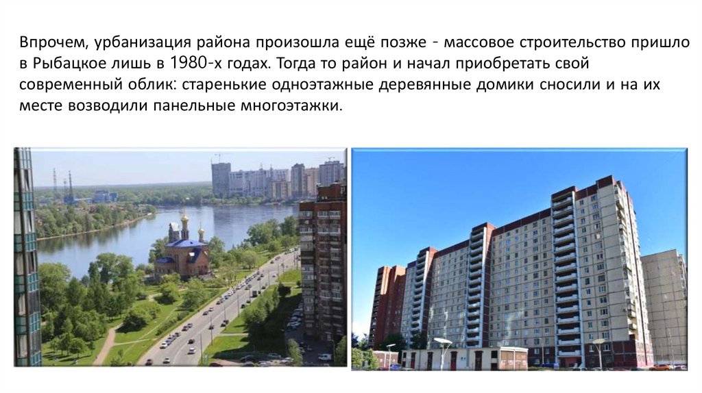 Впрочем, урбанизация района произошла ещё позже - массовое строительство пришлов Рыбацкое лишь в 1980-х годах. Тогда то район и начал приобретать свой