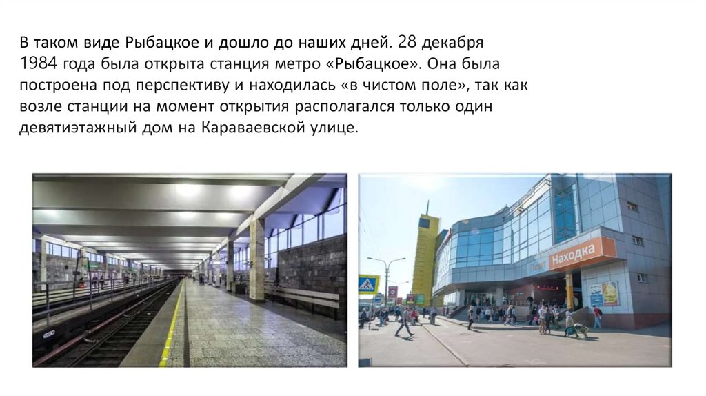В таком виде Рыбацкое и дошло до наших дней. 28 декабря1984 года была открыта станция метро «Рыбацкое». Она была