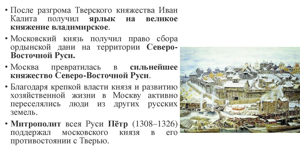 • Старые политические центры — Владимир, Суздаль, Ростов, Муром—теряли влияние, т.к. именно в этих городах появлялись баскаки и