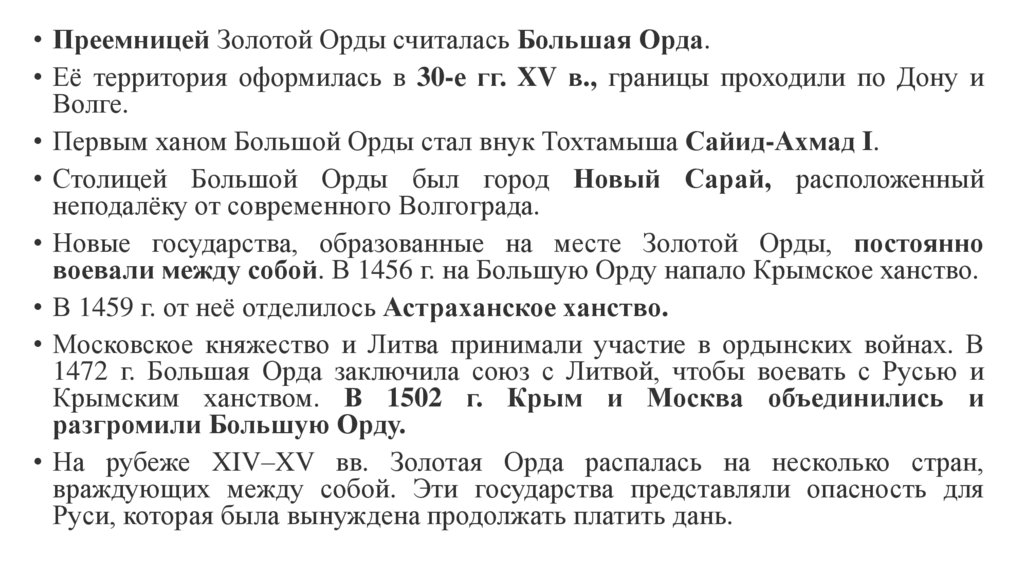 • Преемницей Золотой Орды считалась Большая Орда.• Её территория оформилась в 30-е гг. XV в., границы проходили по Дону и