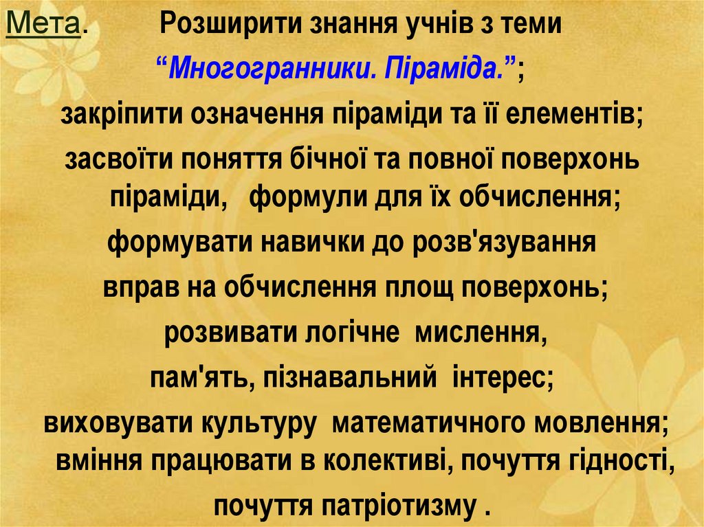 Розширити знання учнів з теми“Многогранники. Піраміда.”;