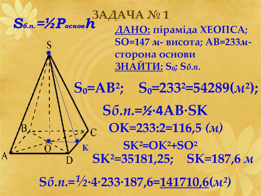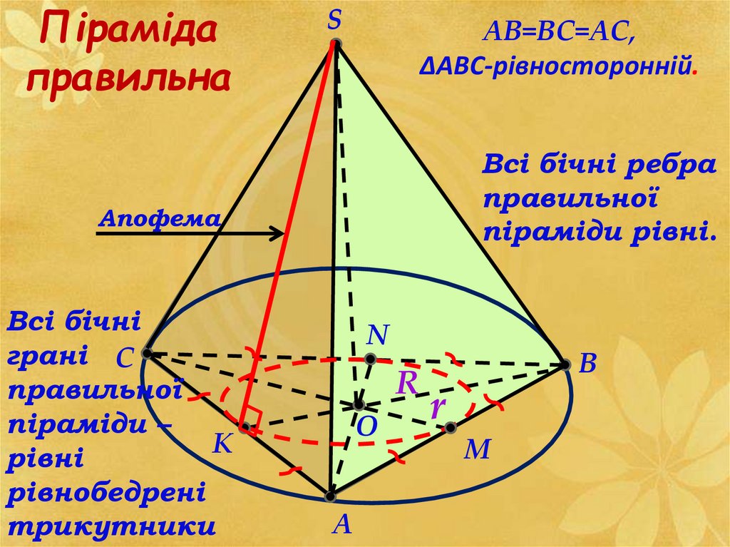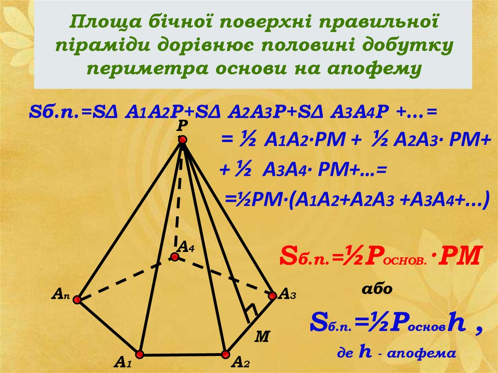 Площа бічної поверхні правильноїпіраміди дорівнює половині добутку