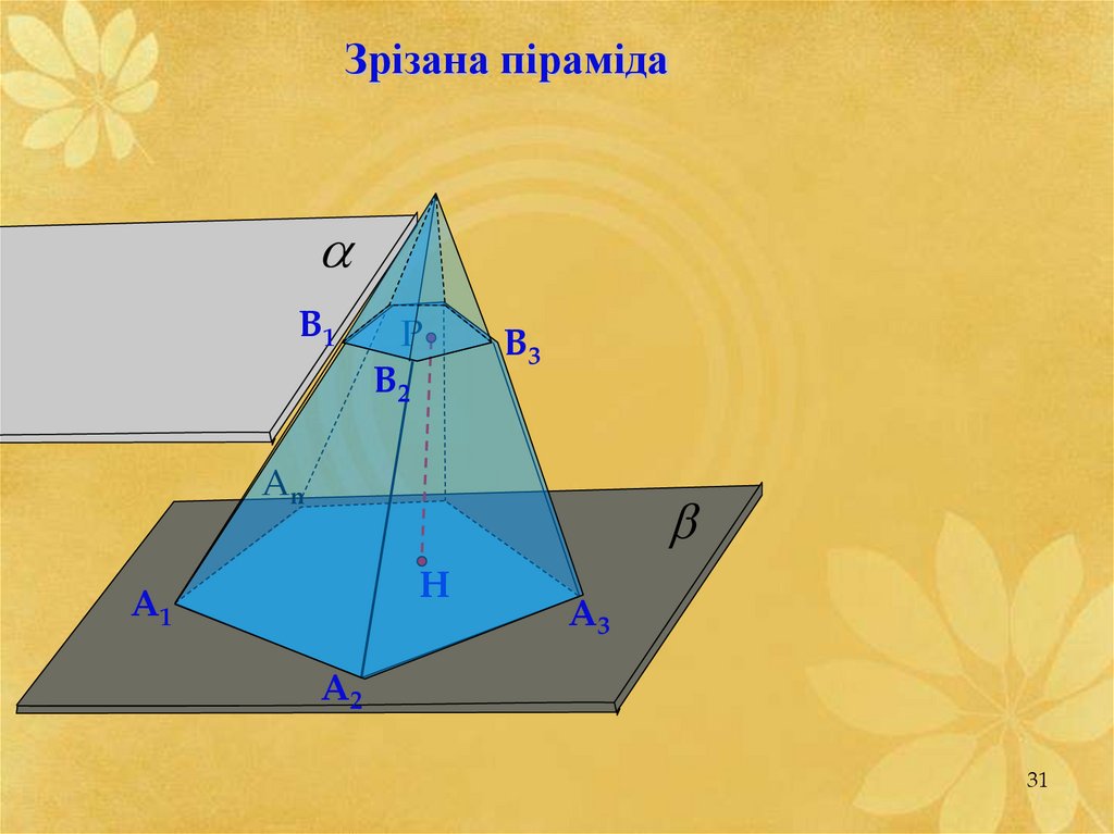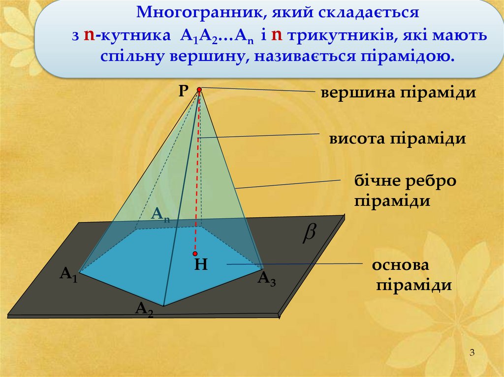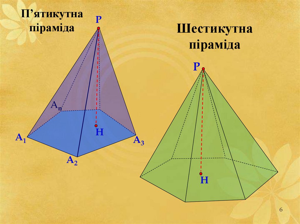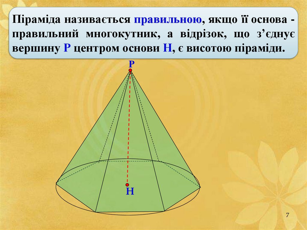 Піраміда називається правильною, якщо її основа правильний многокутник, а відрізок, що з’єднуєвершину Р центром основи Н, є висотою піраміди.
