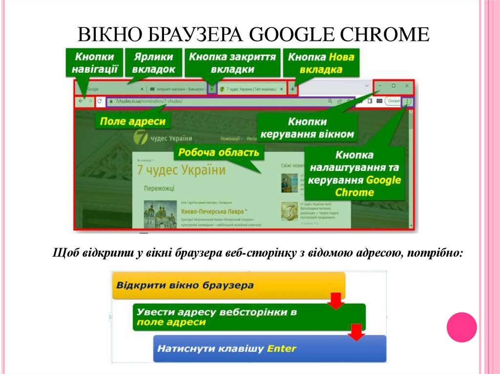ВІКНО БРАУЗЕРА GOOGLE CHROME .Щоб відкрити у вікні браузера веб-сторінку з відомою адресою, потрібно: