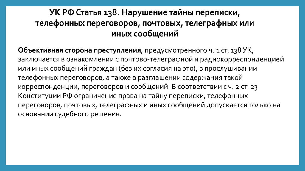 УК РФ Статья 138. Нарушение тайны переписки,телефонных переговоров, почтовых, телеграфных или