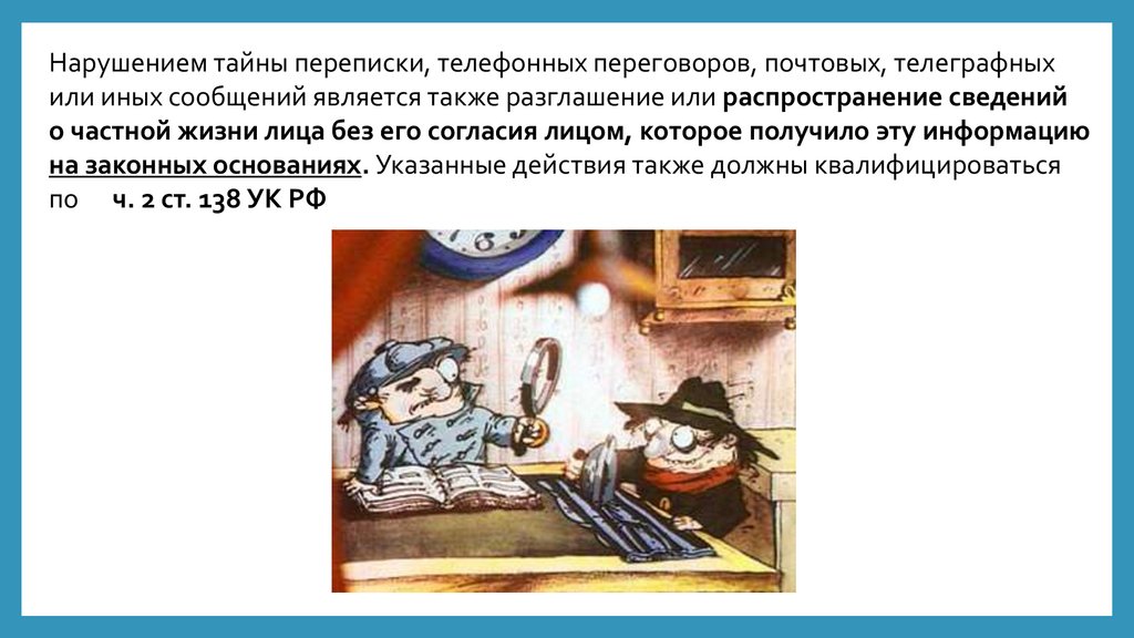 Нарушением тайны переписки, телефонных переговоров, почтовых, телеграфныхили иных сообщений является также разглашение или распространение сведений