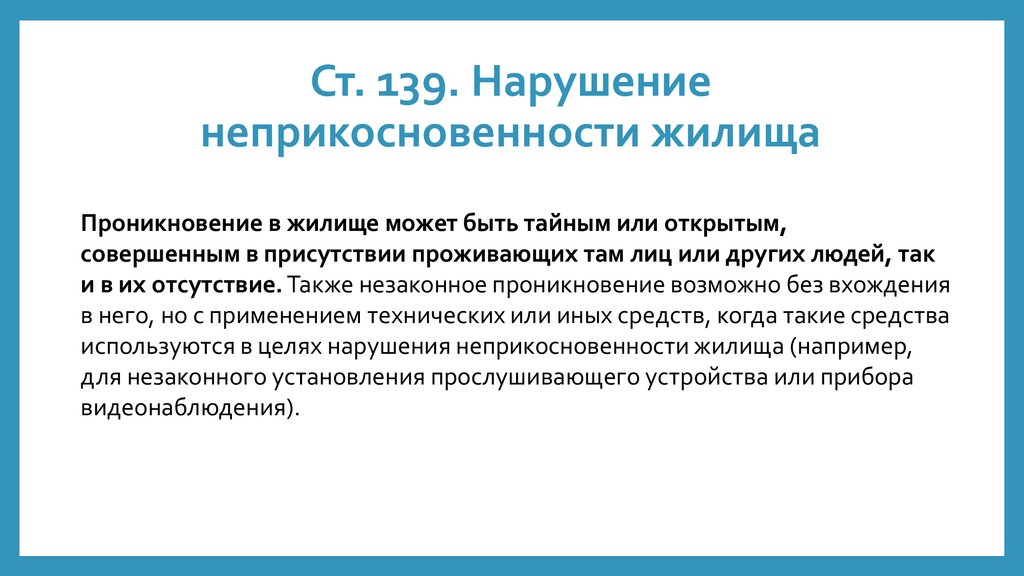 За незаконное проникновение в жилище, совершенное против воли проживающего в нем лица, ст.139 Уголовного кодекса Российской Федерации (далее – УК РФ) предусмотрена уголовная