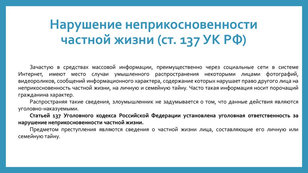 Нарушение неприкосновенностичастной жизни (ст. 137 УК РФ)