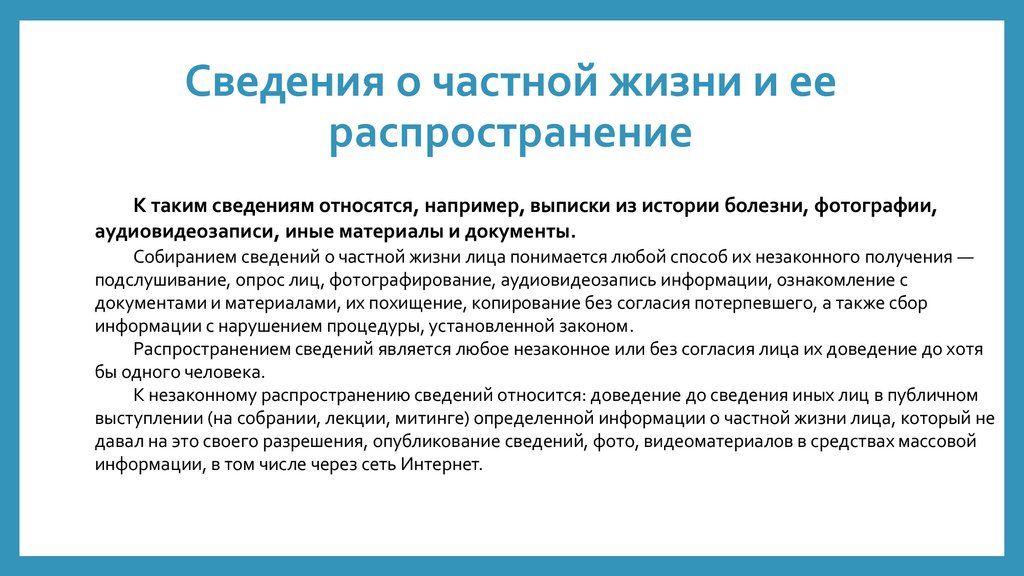 Распространением сведений является любое незаконное или без согласия лица их доведение до хотя