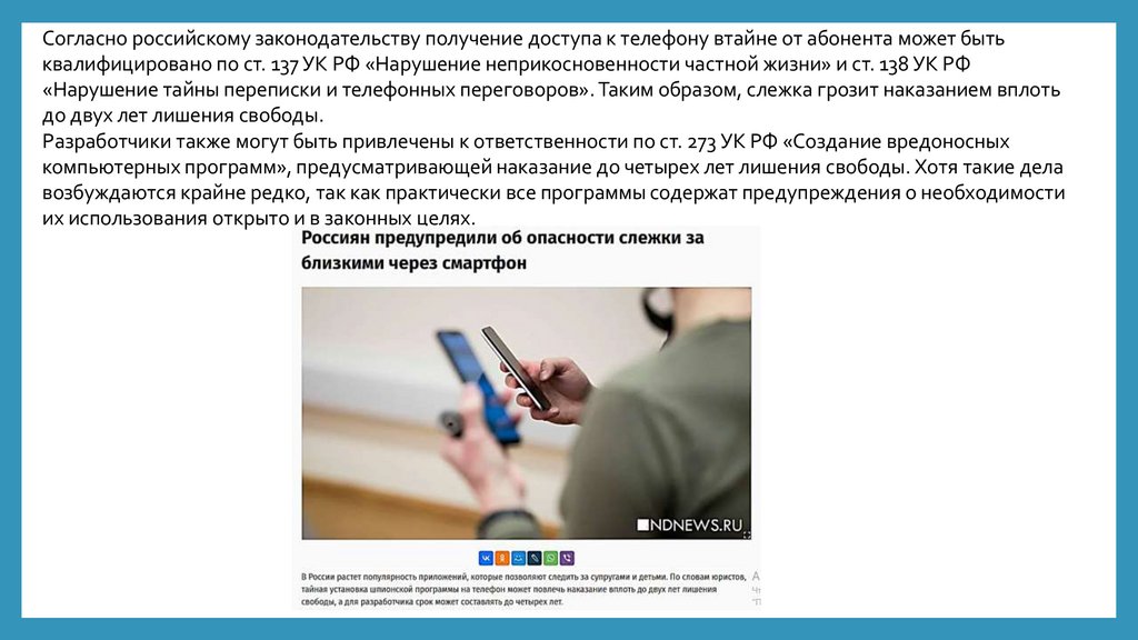«Нарушение тайны переписки и телефонных переговоров». Таким образом, слежка грозит наказанием вплоть