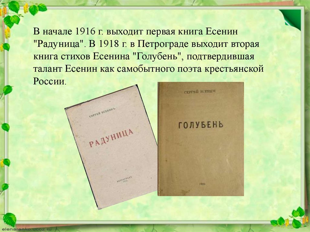 В начале 1916 г. выходит первая книга Есенин"Радуница". В 1918 г. в Петрограде выходит вторая