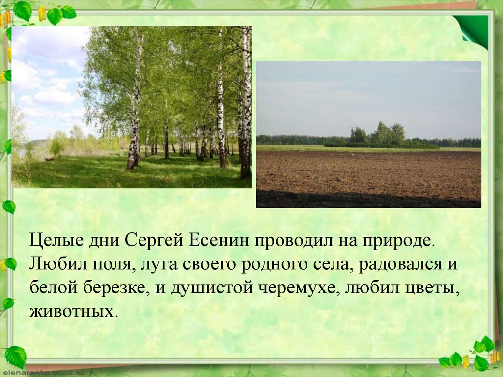 Целые дни Сергей Есенин проводил на природе.Любил поля, луга своего родного села, радовался и