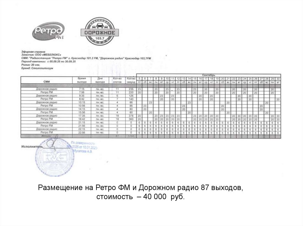 Размещение на Ретро ФМ и Дорожном радио 87 выходов,стоимость – 40 000 руб.