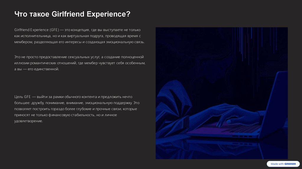 Что такое Girlfriend Experience?Girlfriend E xperience (GFE ) — это концепция, где вы выступаете не только