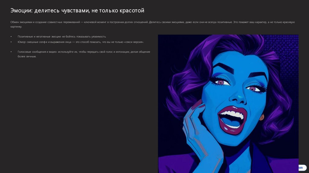 Эмоции: делитесь чувствами, не тол ь ко красотойОбмен эмоциями и создание совместных переживаний — ключевой момент в построении долгих отношений. Делитесь своими эмоциями, даже если они не всегда позитивные. Это покажет ваш характер, а не только красивую