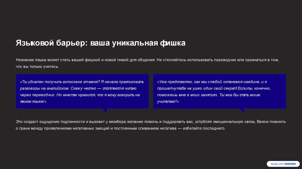 Это создаст ощущение подлинности и вызовет у мембера желание помочь и поддержать вас, углубляя эмоциональную связь. Важно помнить