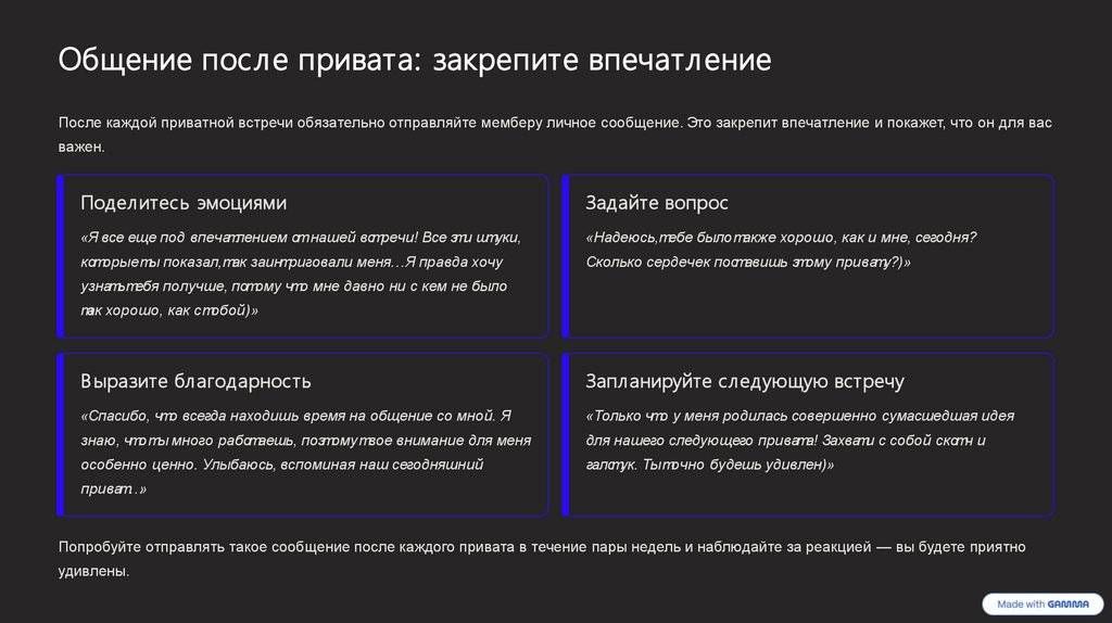 Общение после привата: закрепите впечатлениеПосле каждой приватной встречи обязательно отправляйте мемберу личное сообщение. Это закрепит впечатление и покажет, что он для вас