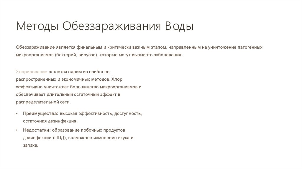 Методы Обеззараживания ВодыОбеззараживание является финальным и критически важным этапом, направленным на уничтожение патогенных