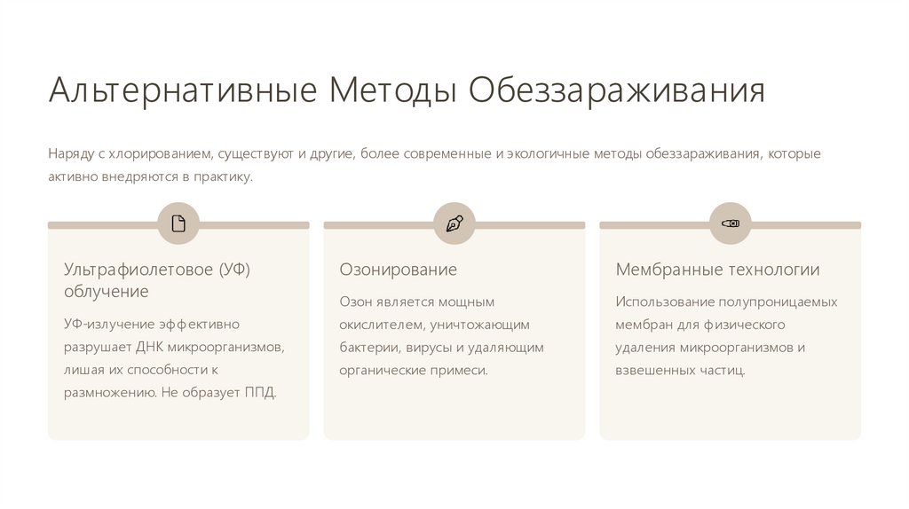 Альтернативные Методы ОбеззараживанияНаряду с хлорированием, существуют и другие, более современные и экологичные методы обеззараживания, которые