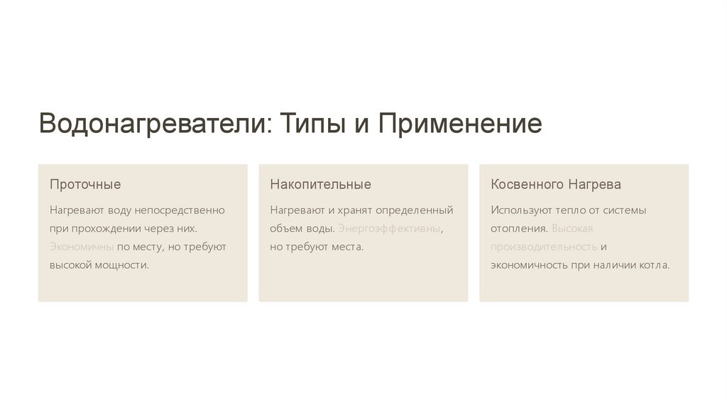Проточные, накопительные, косвенного нагрева.