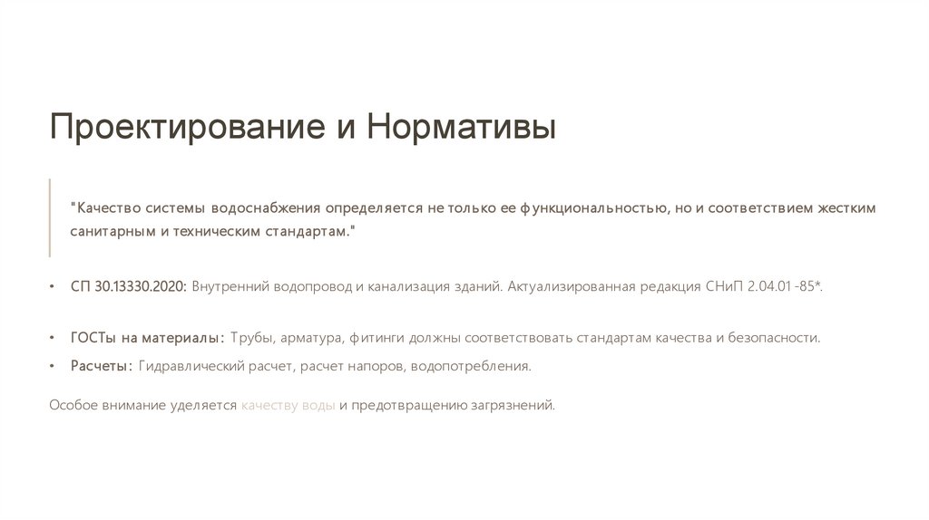 Проектирование и Нормативы" Качеств о системы водоснабжения определ яется не толь ко ее ф ункциональ ность ю, но и соотв етств ием жестким