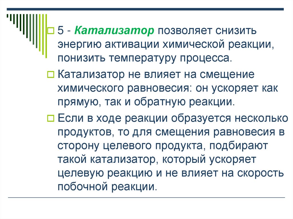 5 - Катализатор позволяет снизитьэнергию активации химической реакции,