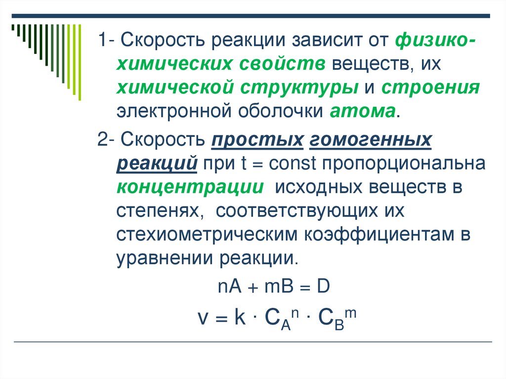 1- Скорость реакции зависит от физикохимических свойств веществ, иххимической структуры и строения