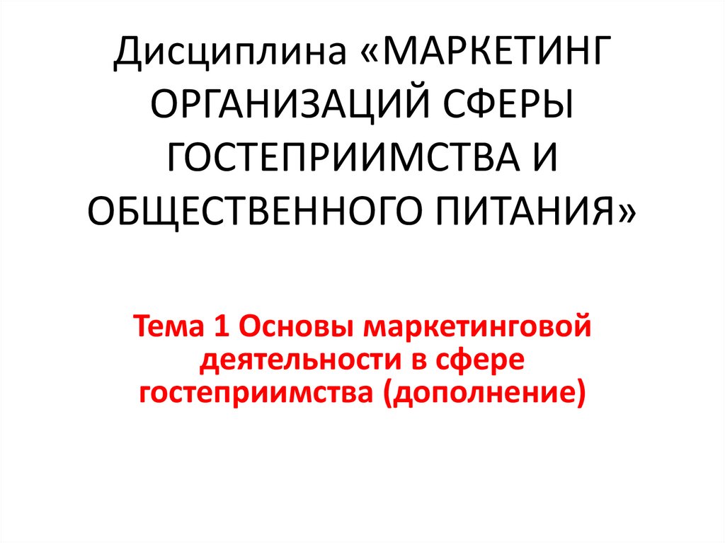 1. Дисциплина «МАРКЕТИНГ ОРГАНИЗАЦИЙ СФЕРЫ ГОСТЕПРИИМСТВА И ОБЩЕСТВЕННОГО ПИТАНИЯ»