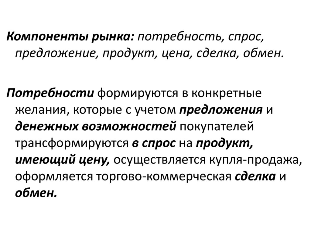 Компоненты рынка: потребность, спрос,предложение, продукт, цена, сделка, обмен.