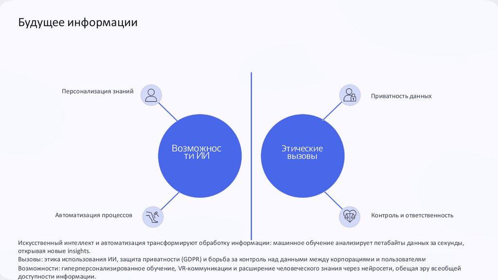 Вызовы: этика использования ИИ, защита приватности (GDPR) и борьба за контроль над данными между корпорациями и пользователями.