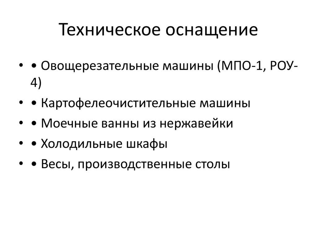 Техническое оснащение• • Овощерезательные машины (МПО-1, РОУ4)
