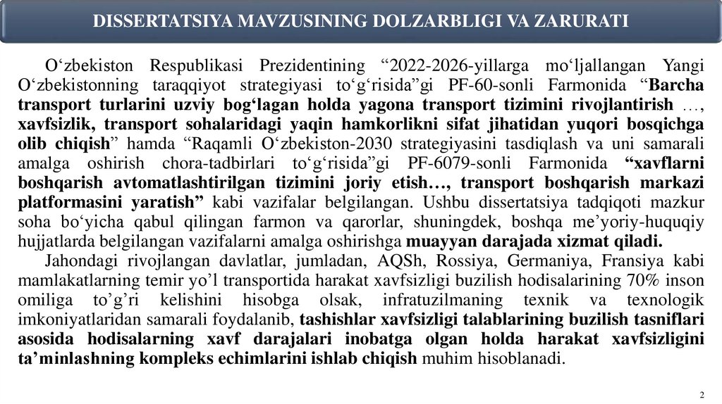 DISSERTATSIYA MAVZUSINING DOLZARBLIGI VA ZARURATIO‘zbekiston Respublikasi Prezidentining “2022-2026-yillarga mo‘ljallangan Yangi