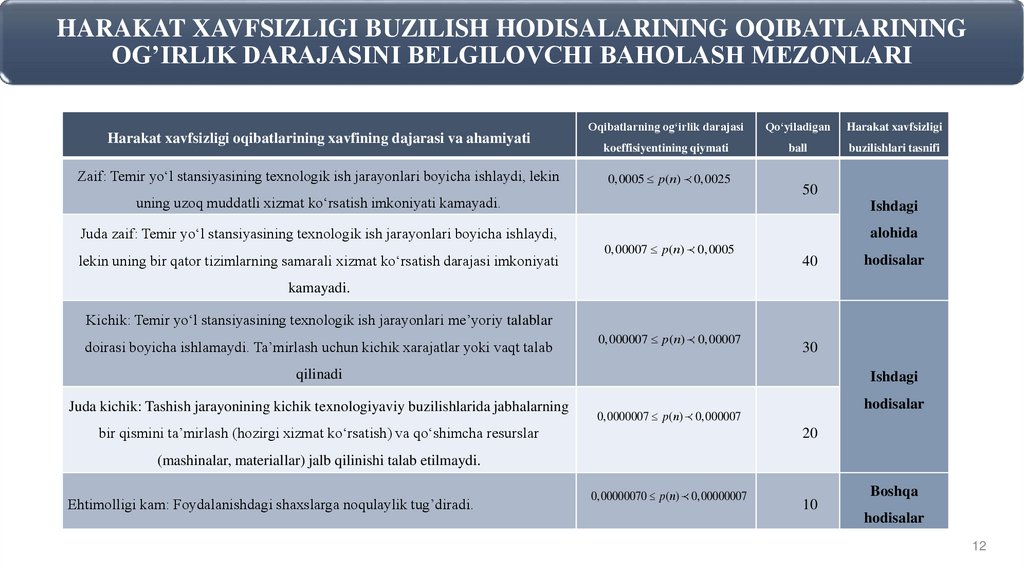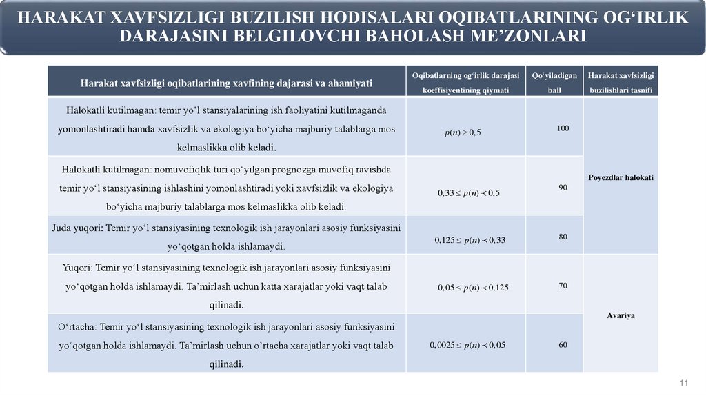 holda hodisalarning xavf darajalari belgilangan. Natijada poyezdlar harakati bilan bog’liq
